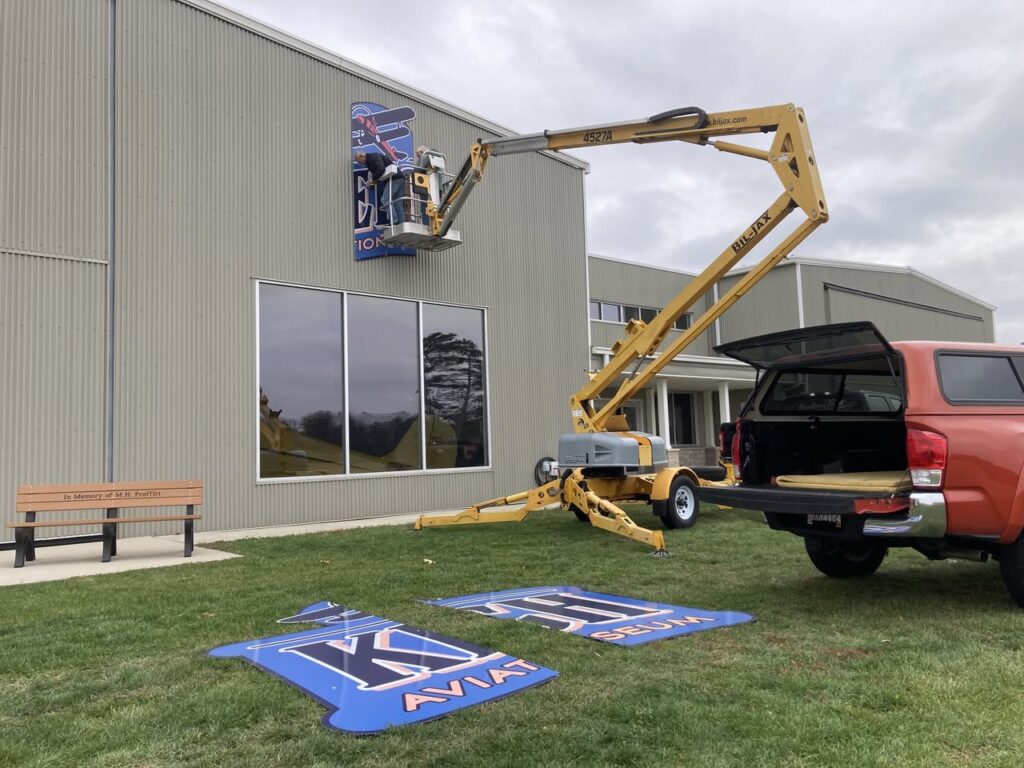 Brodhead Sign Co. was busy again at the museum today, repurposing the original museum hangar sign on the airport side of the facility. If you fly-in to Brodhead Airport, there’s no way to miss us now!
